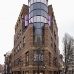 The glazed drum at high level contrasts with the remainder of the striped brick elevations. The shopfronts are neat, unobtrusive and appropriately painted in dark red, without projecting blinds and only one, neat and modern, externally illuminated projecting sign.